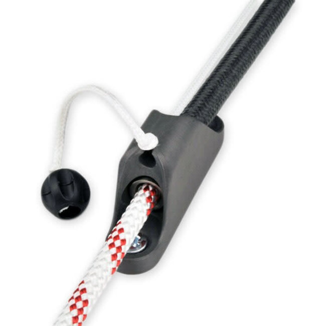 Extremely simple and totally efficient, this system uses the principle of squeezing capacity offered by braided sleeves. As the line comes under load it is instantly squeezed by the Aramid Technora® sock. The higher the tension, the greater the hold. The rope is not pressed between two metallic parts as with conventional clutches protecting the line from deformation, wear, and chafe.