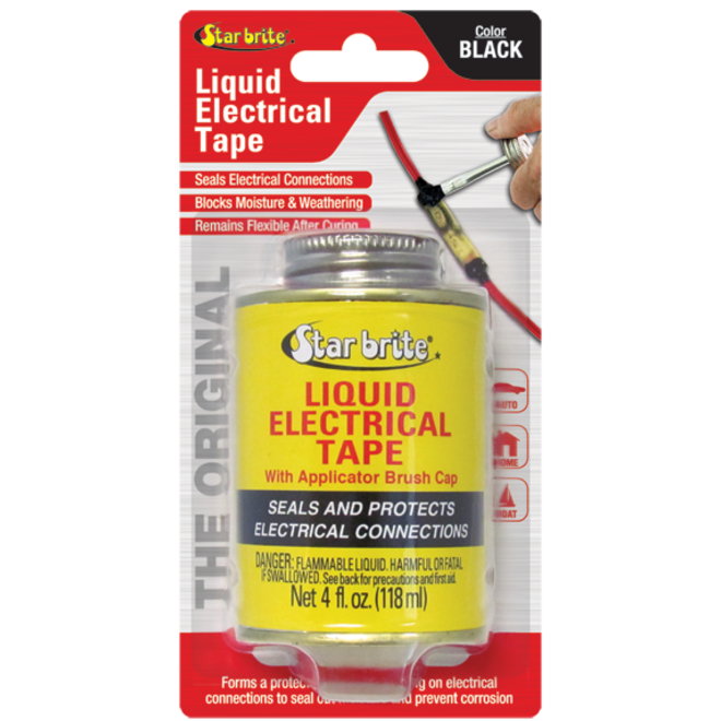 Liquid Electrical Tape (LET) is easy to use, providing an airtight, waterproof, dielectric coating in minutes. The coating will last for the life of the application, yet it can be removed immediately as needed. One application will protect terminal connections or splices, as well as guard against vibrations that can loosen connections. Star brite Liquid Tape is UL-tested, easy to use and reliable.