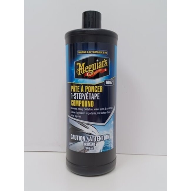 Meguiar's® Marine One Step Compound is an advanced aggressive, yet safe cutting compound with polish that cleans and restores gloss to gel coat surfaces in one step. It removes moderate to heavy oxidation, scratches, stains, and tough water spots on all fiberglass and painted gel coat marine or RV surfaces. Incredible results by hand or by machine.