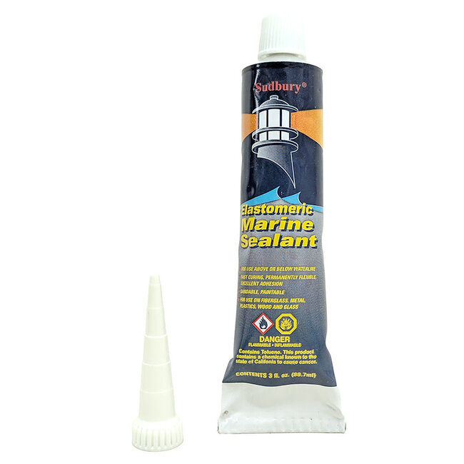 For use above and below waterline. Flush and overlapping joints, bedding of hardware, thru hulls, windshields, portholes, and electrical connections. Ensure surface is clean dry and free from any foreign material. If necessary, clean with acetone to remove any dirt and grime. Priming is normally not necessary. Cut tip and puncture seal, apply sealant to the substrate or void. Once filled, use mineral spirts on your tools to smooth surface. Sudbury® Elastomeric Sealant skins within 10 minutes but requires mechanical fastening and a cure time of 1 to 7 days depending on the temperature and humidity. Best used between 40F and 130F. Sealant may be sanded and painted once fully cured. To test for cure, apply small amount of pressure to sealant. Fully cured sealant will leave no marks once pressure is released. Use mineral spirits for cleanup. 1/4′ bead will cover 39 lineal feet.